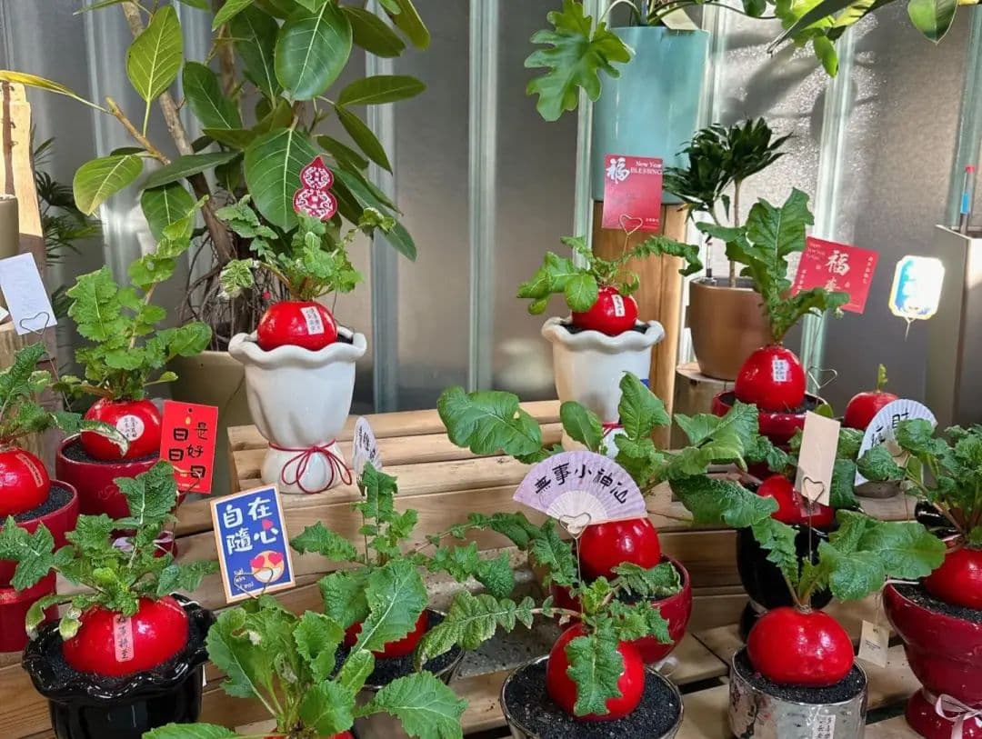 现在,作为年宵花的红皮萝卜,不仅被洗得干干净净,有了自己的精致小瓷盆独居单间,还被贴上了各种吉祥挂饰,就连身价也翻了20—50倍——在不同地区和花店里,一盆红皮萝卜年宵花,售价能达到28—100元。