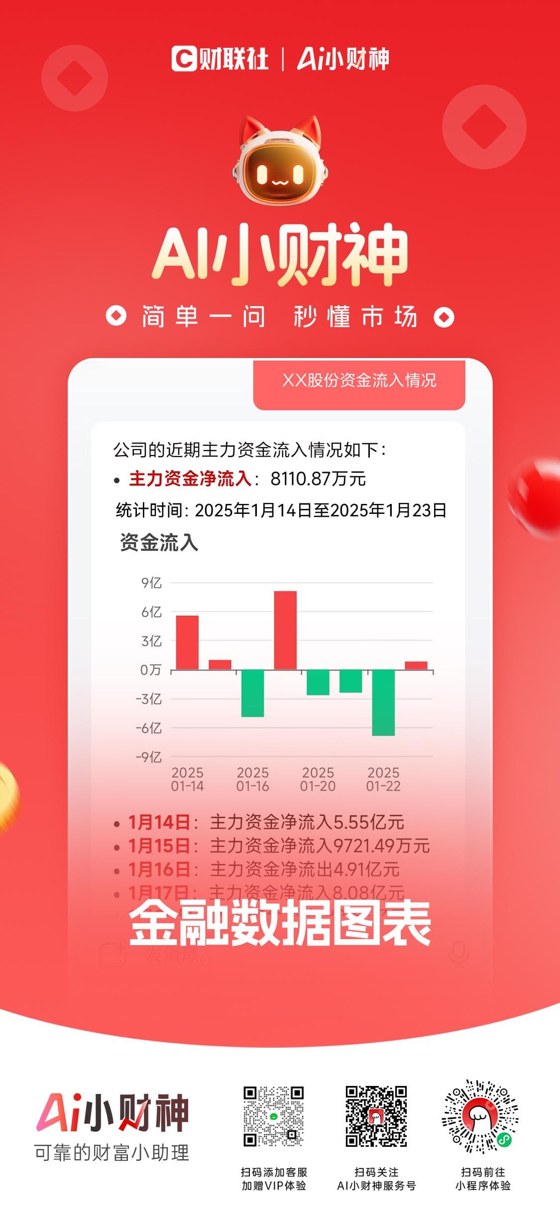 自2024年12月18日公测以来,“简单一问,秒懂市场”的“AI小财神”受到投资者喜爱。经过多轮用户调研,“AI小财神”持续迭代,将A股实时行情接入AI对话环节,方便用户无需跳出小程序,直接查看相关标的、板块行情走势等信息。