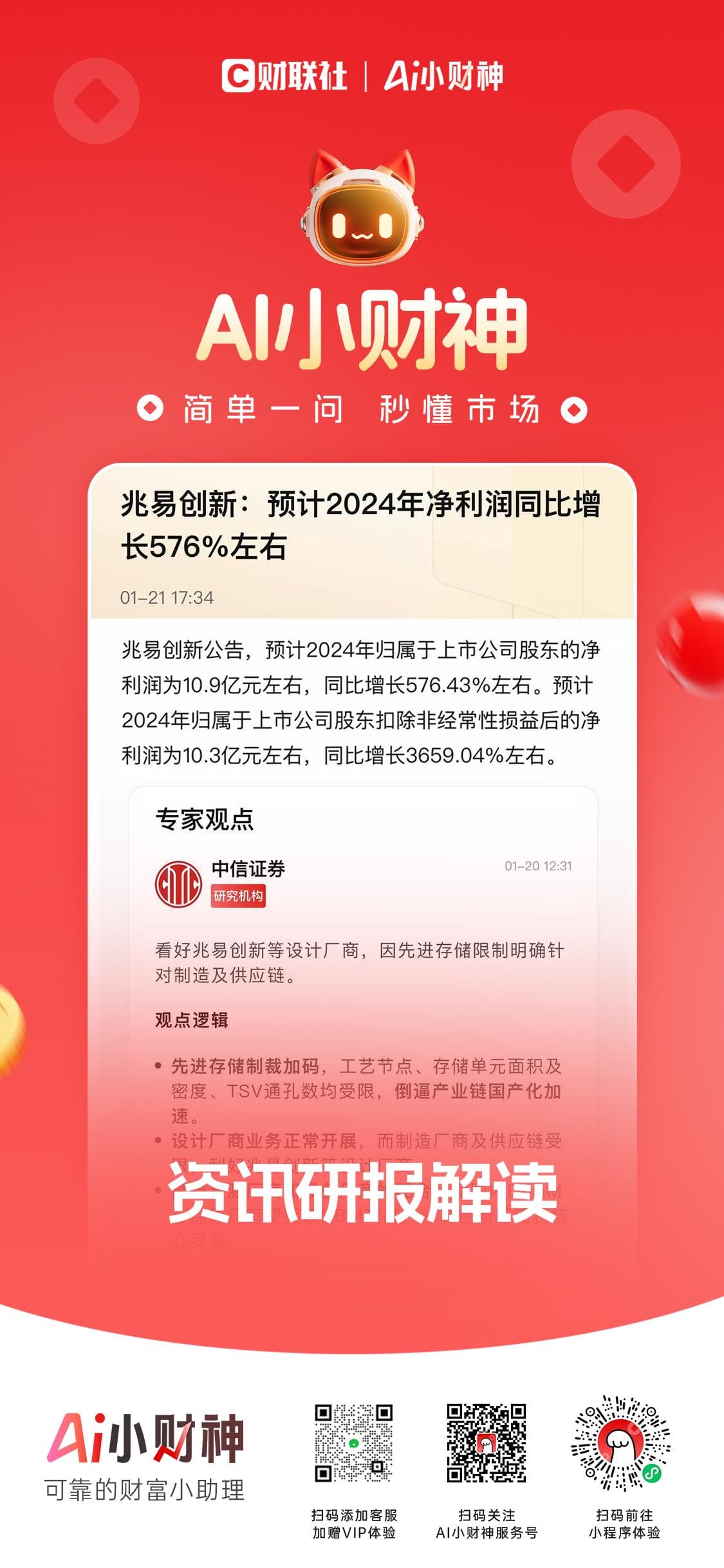 为做好资讯深度解读,“AI小财神”进一步引入专业研究机构的精华观点摘要,通过AI算法匹配至相关资讯进行延伸解读,真正做到“秒懂市场”。