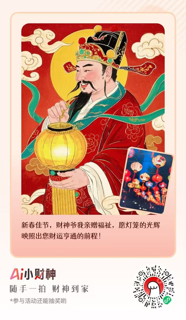 此外,春节期间,“AI小财神”还推出了“拍照寻财神”有奖活动,邀请用户一起寻找专属财神祈福迎春。用户只要在微信小程序中搜索“AI小财神”,随手拍照上传照片即可参加,还有机会获得iPhone16 Pro、小财猫玩偶等礼品。