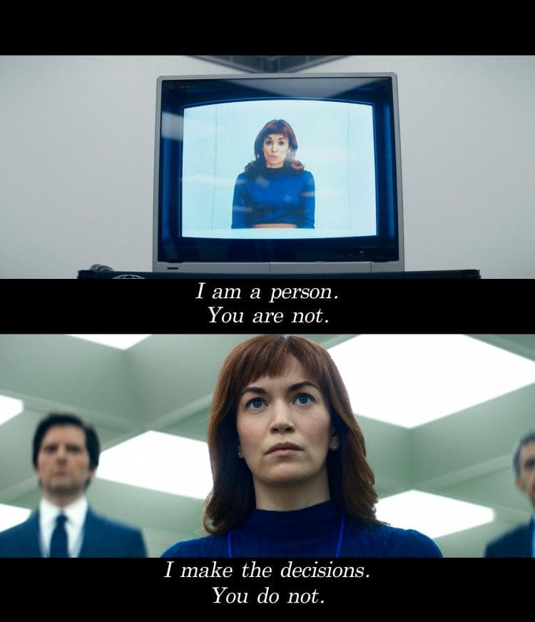 剧集中呈现最多的,是员工们被实施记忆切割术后,他们的工作人格遭遇的种种制度上的规训,以及随之而来的进一步的自我剥削。
