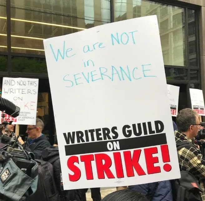 在好莱坞大罢工游行中,《人生切割术》团队也走上了街头,他们高高举起的牌子上写着一句话:“我们并不活在戏里。你有你的,我有我的,需要直面的生活。”