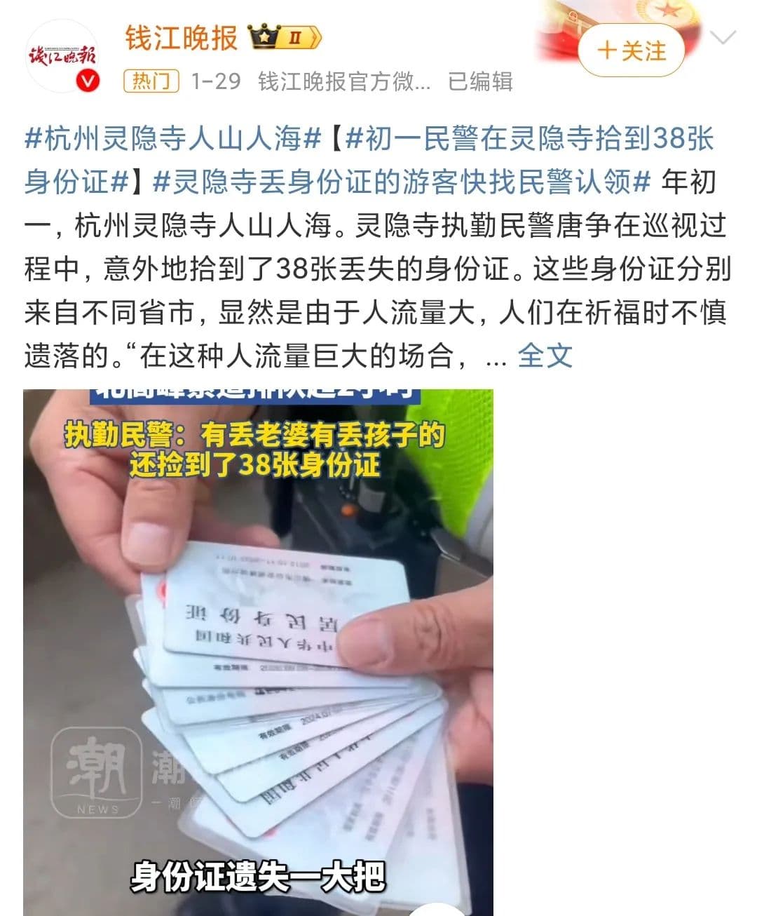 大年初一,有个在灵隐寺执勤的民警表示:找人的有十二三起,捡到了38张身份证。