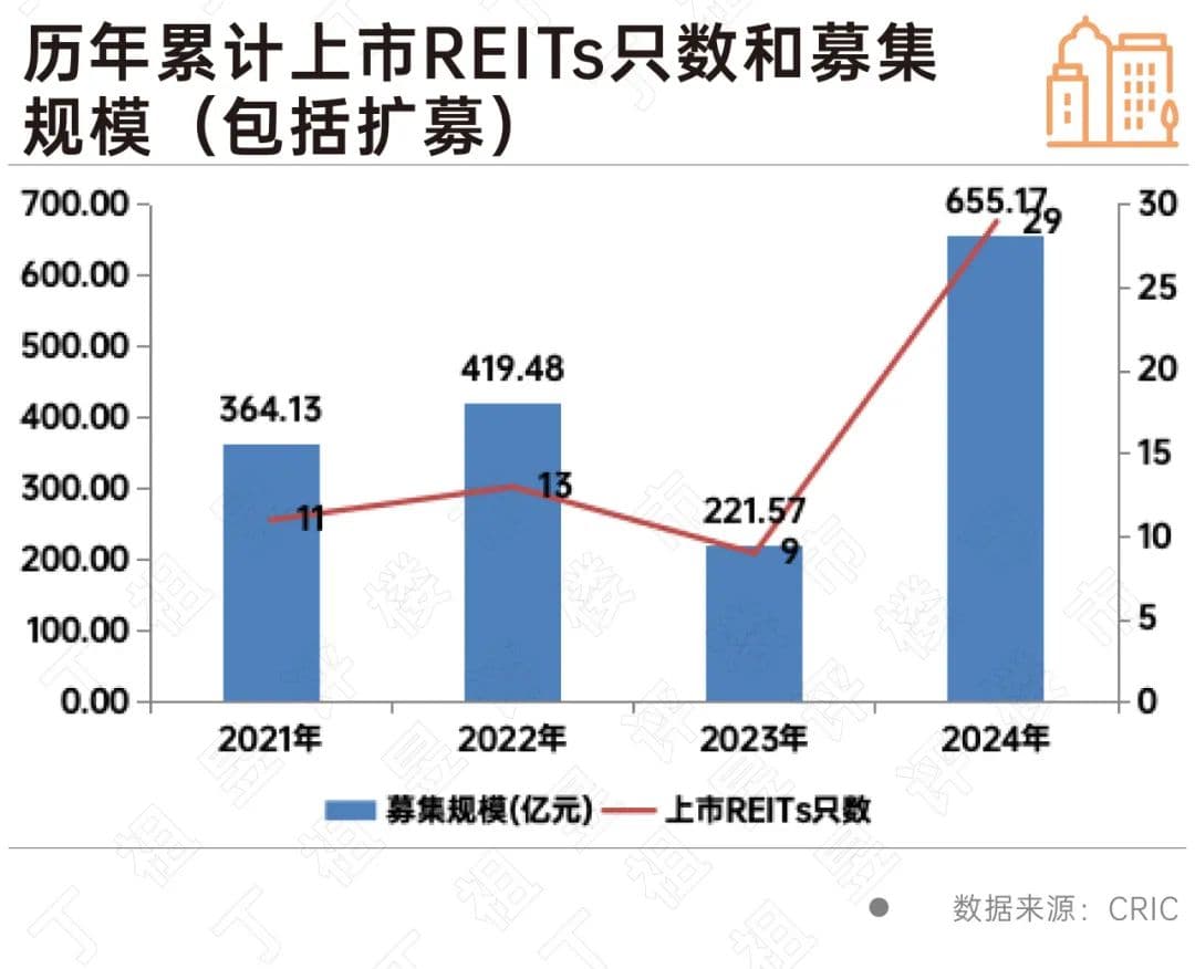 在政策利好不断加码的背景下,截至2024年底,2024年已有29只公募REITs完成了上市,募集资金总额为655亿元,创下了近年来的新高,同时我国公募REITs已上市的总规模也达到了1660亿元。