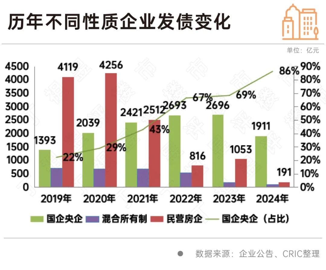 从企业的性质分类来看,2024年国企、央企的发债量为1911亿元,同比下滑了29%;民营企业发债量为191亿元,同比大幅下降82%;混合所有制房企发债量为107亿元。可以看出各类房企的发债量均出现了一个大幅的下滑,但民企发债量下降更快。在此背景下,央国企发债的占比自2020年出现了大幅上升,2024年更是升到了86%,达到历年最高点。