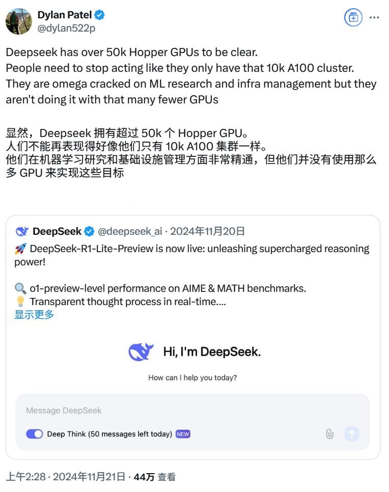 但实际上,我们不知道 Alexandr Wang 的消息来源。他可能是参考了 2024 年 11 月 Dylan Patel 的一条推文,该推文声称 DeepSeek 拥有超过 50,000 张 Hopper GPU。