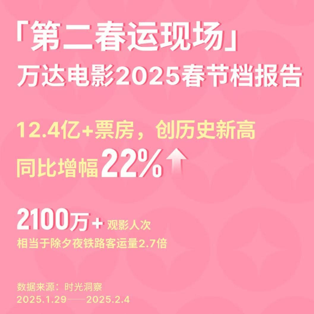 据报告,今年春节档,万达影城的票房创历史新高,超过了12.4亿元,同比增长22%。在过去七天里,有超2100万人次的观众,选择来到万达影城,这一数字也相当于今年除夕,铁路客运量的2.7倍。作为新民俗,春节观影深刻地嵌套在了当代人的生活仪式中。