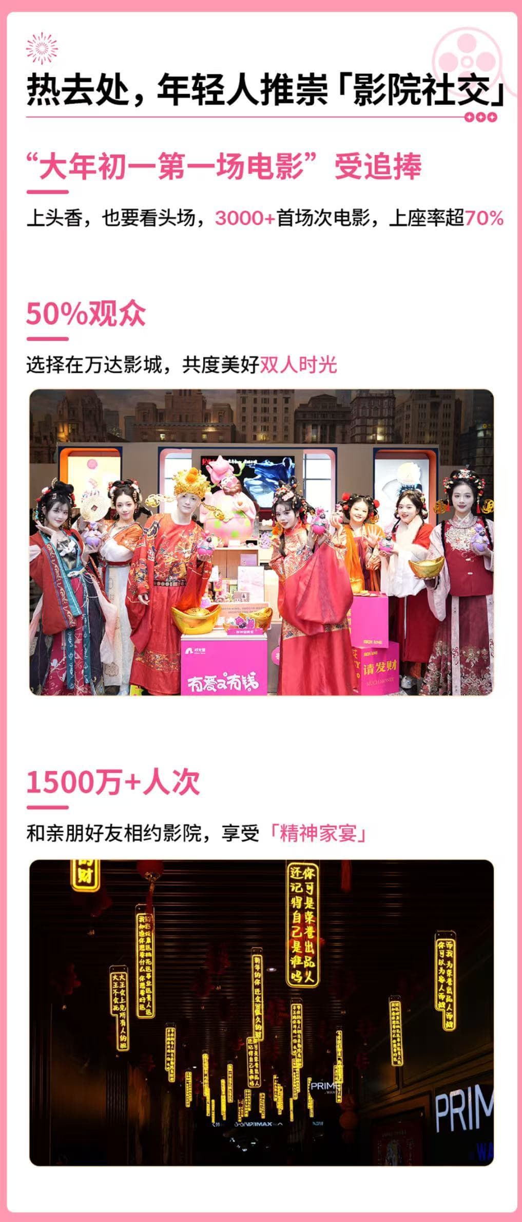 观影需要沉浸感,但银幕之外,年轻人也推崇“影院社交”。今年春节档,50%的万达影城观众,选择结伴而来,享受双人时光。有超过1500万人次的观众,是和亲朋好友一起,在万达影城品尝了“精神家宴”。玩梗、整活也应运而生,“新年的第一场电影”引得Z世代争相打卡:大年初一一早,有超3000场次的放映,上座率超过了70%。