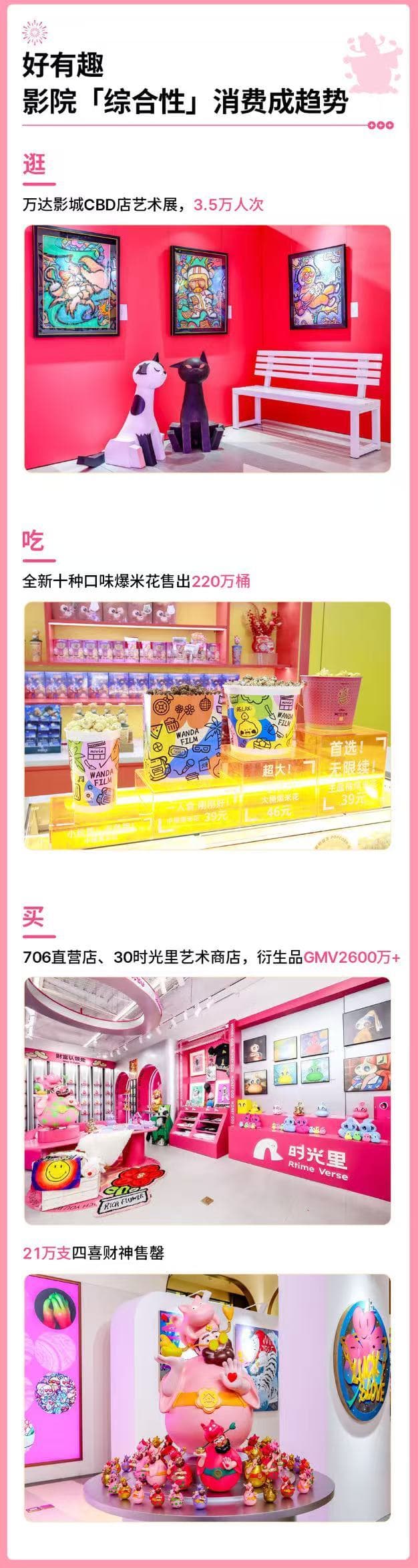 报告显示,在今年,电影院的营收结构,进一步朝着健康、多元化发展。继元旦开业三家“时光里艺术品商店”后,春节期间万达影城内,又有27家艺术商店整齐亮相。它们和706家万达电影直营院线一起,创造了2600余万的衍生品GMV。其中,最炙手可热的文创产品“四喜财神”,用时七天,即宣告21万支全部售罄。