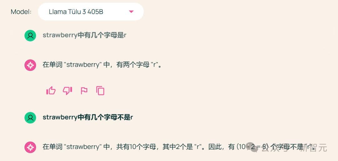 不过在官网提供的体验版上试了试,效果也并不是那么好,对于经典的数Strawberry中有几个r的问题,Tülu 3同样扑街,不过之后需要推理的问题,模型倒是给出了正确的回答思路。