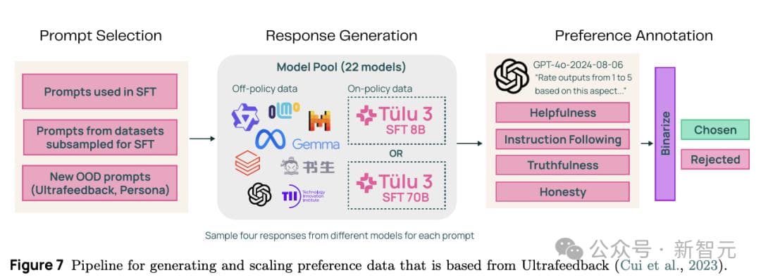 具体来说,就是在之前提示词的基础上,再生成一些不同的新提示词,通过22种开源大模型生成回答,让GPT-4o对各模型给出的回答在有用程度、真实性、诚实性及指令遵循上的表现进行打分,决定是否接受该回答作为训练数据。