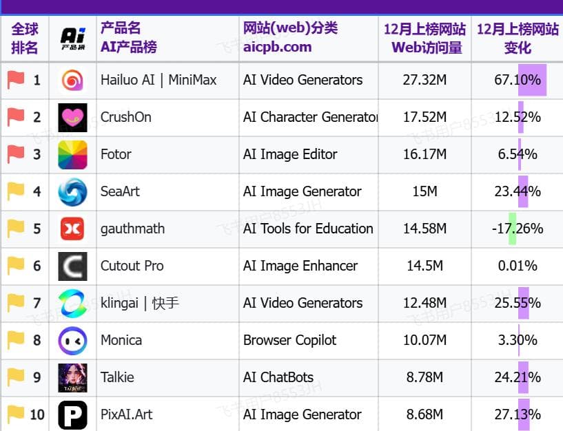 2024年,中国出海AI应用开始崭露头角,比如Hailuo AI、Fotor等5款产品进入AI产品(网站榜)全球流量TOP50,另有5款进入第51-80名。