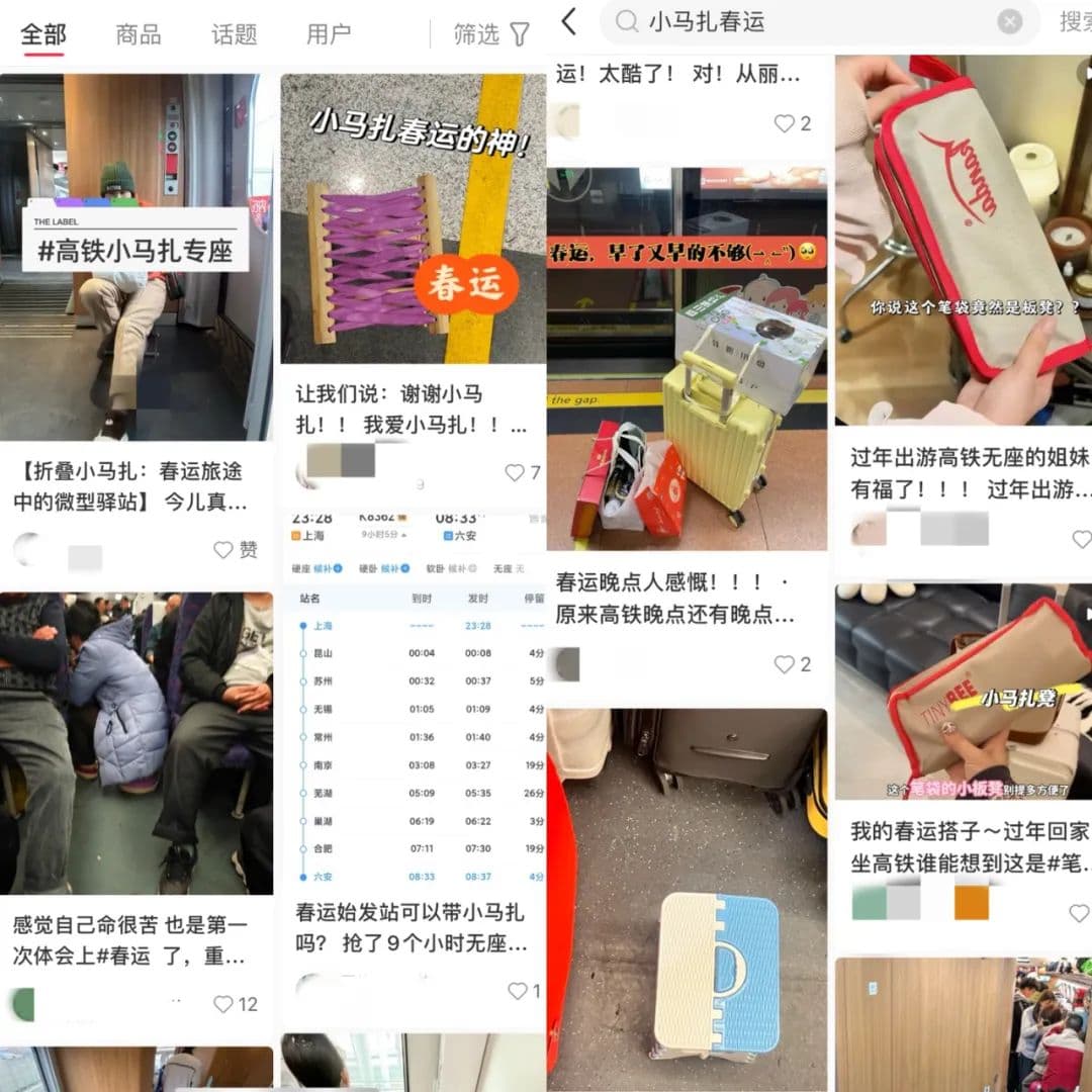 场景拓展、产品升级以及社交媒体分享,推动了小马扎的“出圈”,而春运场景,则进一步激发了小马扎的市场需求——对于在春节期间大量需要返乡、回程,又没有买到票的乘客来说,小马扎成了他们缓解旅途疲劳的重要工具,而几元到几十元不等的售价,人手一个也没什么压力。