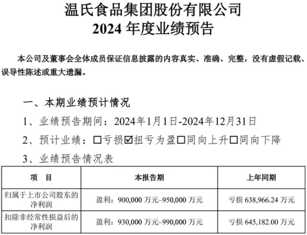 前段时间,养殖巨头温氏股份发布2024年度业绩预告。数据显示,2024年全年,温氏股份预计实现净利润为90亿元–95亿元,实现扭亏为盈,上年同期亏损63.9亿元;扣除非经常性损益后的净利润约为93亿元–99亿元,上年同期亏损64.5亿元。