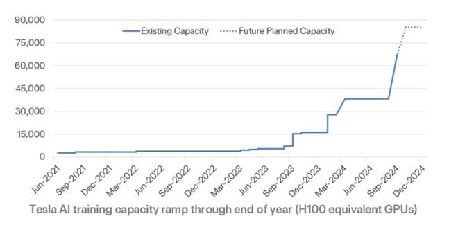 在FSD的训练算力方面,财报显示,特斯拉目前的算力约为等效6.75万张英伟达H100芯片(67.5 EFLOPS算力),到10月底预计会再增加2.1万张H100,总算力将达到88.5EFLOPS。