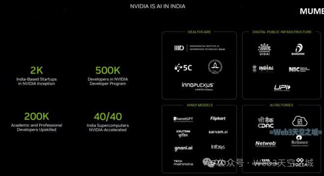 印度的Nvidia有一个非常丰富的生态系统。要在任何行业或国家建立人工智能生态系统,首先需要建立基础设施生态系统。我们宣布Yoda、E-2-E、Tata Communications和其他合作伙伴将与我们一起构建印度的基础设施。今年年底,印度的计算能力将比一年前增长近20倍。建设AI生态系统的第一步是AI基础设施,类似于互联网生态系统建设中的网络基础设施,包括个人电脑、云和内联网。