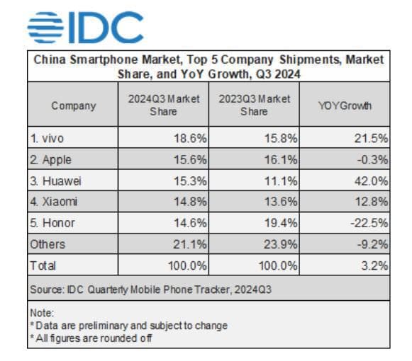 周五,市场研究机构IDC的最新统计数据显示,苹果在第三季度以15.6%的市场份额在中国排名第二,但份额相比于上年同期则小幅下滑0.5个百分点,而竞争对手之一的华为则以15.3%的市场份额仅次于苹果排名第三,份额同比增长4.2个百分点。