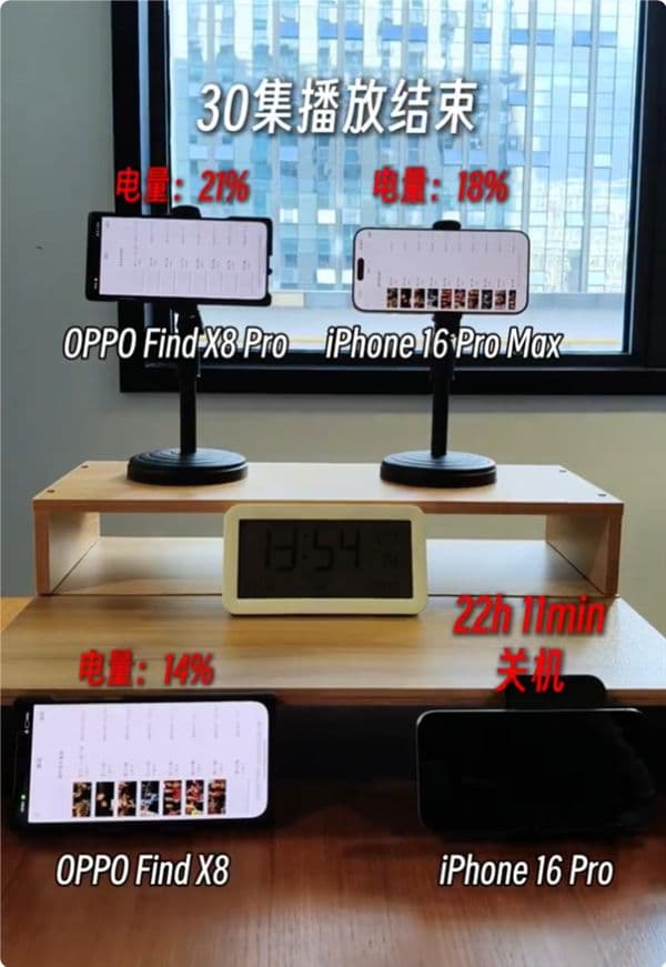 续航方面,OPPO Find X8 Pro也带来了惊喜。在OPPO内部进行的极限测试中,该机一口气播放了一整部30集的电视剧后,电量还剩21%,轻松超过了业界续航口碑非常好的iPhone 16 Pro Max。