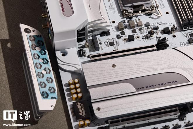 CPU 插槽下方是 PCIe5.0x4 规格的主 M.2 硬盘位,覆盖有定制造型的银白散热装甲,左右各有一颗螺丝进行固定,内部采用快拆固定旋钮。显卡插槽规格为 PCIe5.0x16,四周做了铝合金加固,承重更足。