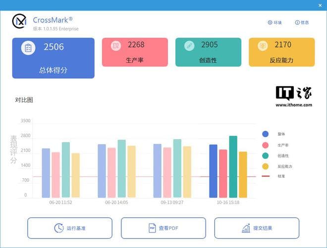 在 CrossMark 中,酷睿 Ultra 9 285K 表现较为强势,综合成绩达到了 2506 分,创造性得分 2905 分。