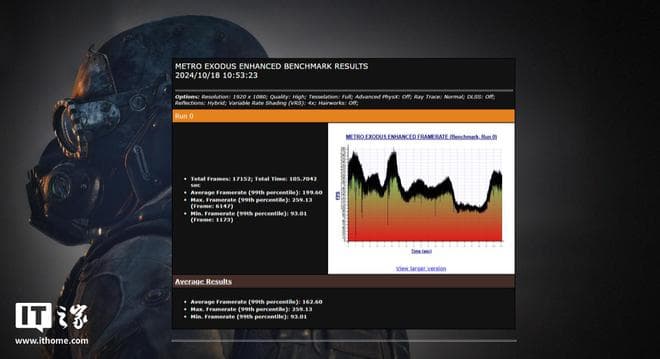 第三款《地铁:逃离》,选择 1080P 分辨率 + 高画质预设运行游戏自带基准测试,酷睿 Ultra 9 285K 游戏平均帧数为 199 帧,1% Low 帧 127 帧。