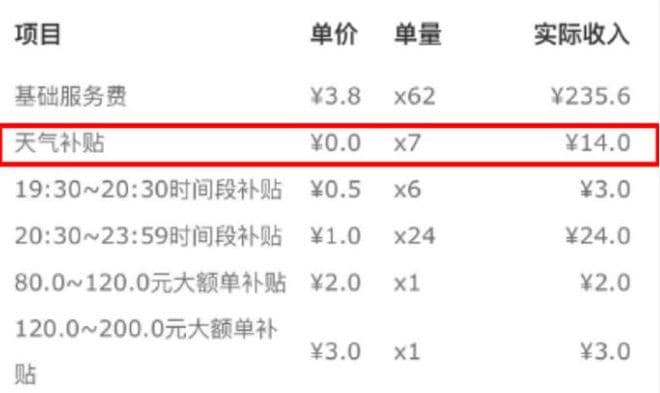 小刘说,外卖小哥在高峰期,送一单主站的外卖,能拿到 5 块多的配送费,就算在平峰期也有 4 块多。而且根据天气、时间的不同,还会有额外的补贴。