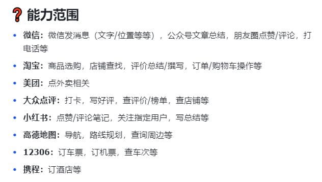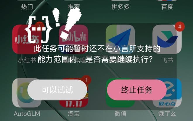很多系统级别的任务,像换个壁纸,目前它还做不到。让它去支付宝里,给你偷能量、喂小鸡,它也会无奈地说自己不会 ( 这个建议赶紧上架,很需要 )。