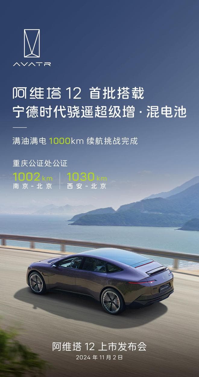 阿维塔官方昨日发文宣布,阿维塔 12 增程版轿车将首批搭载宁德时代骁遥超级增・混电池。重庆公证处公证,该车从南京到北京(1002km)/从西安到北京(1030km)满油满电 1000km续航挑战完成。