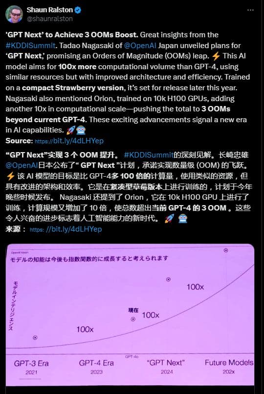OpenAI的高管Shaun Ralston之前在社交媒体X发帖表示,按照计划目标,猎户座的算力将达到GPT-4的100倍,其推出将标志着AI能力的新时代。据悉,OpenAI的终极目标是通过不断迭代构建大模型,最终实现通用人工智能(AGI)。