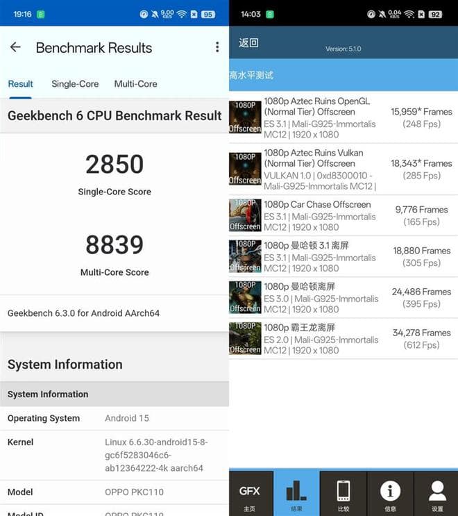 在GFXBench测试中,1080P流向基准测试,阿兹特克废墟OpenGL、阿兹特克废墟Vulkan、赛车追逐、曼哈顿3.1、曼哈顿离谱、霸王龙离屏,分别给出了248 FPS、285 FPS、165FPS、305 FPS、395 FPS、612FPS的成绩,其GPU性能同比天玑9300提升了45%以上。