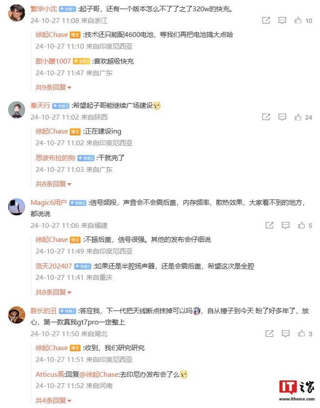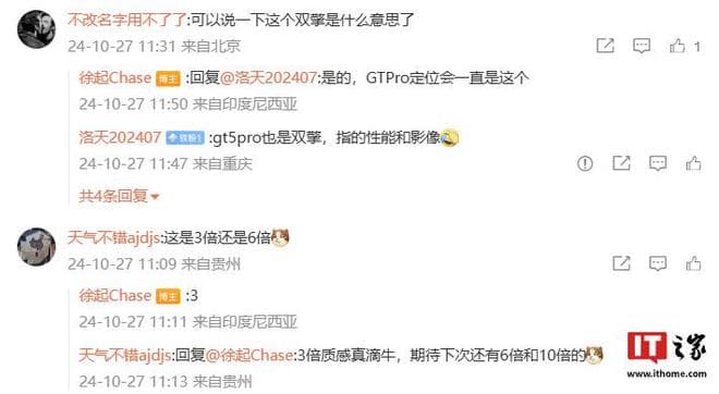 另外,徐起还在评论区中回复了部分网友的问题:针对 320W 快充版本机型的缺失,他表示“技术还只能配 4600 电池,等我们再把电池搞大点”;针对真我手机“双擎”的含义,他称“GT Pro 定位会一直是这个(性能和影像)”;针对新机长焦是 3 倍还是 6 倍,他直言“3”。