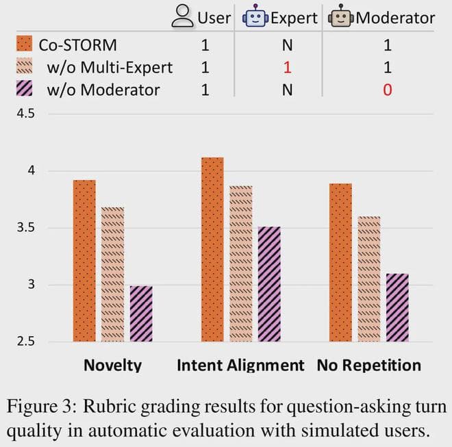 Co-STORM 的一个关键特性是 LM 智能体可以代表用户提问。如下图 3 所示,在检查提问轮次时,Co-STORM 多智能体设计的优势变得更加明显,只需要一位专家和一位主持人就可以极大地获益。