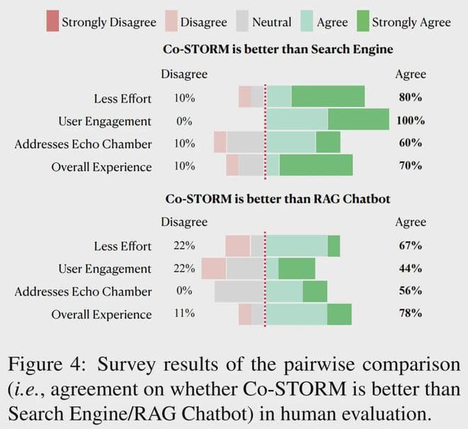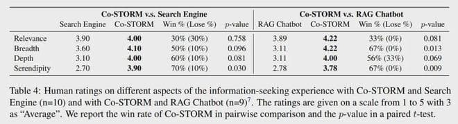 下表 4 为人工评分结果,图 4 为成对比较结果。可以得出结论,CoSTORM 可以帮助用户找到与其目标相关的更广泛、更深层次的信息。