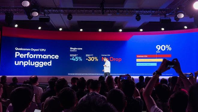 在当天的主题演讲中,高通 CEO Cristiano Amon 回顾完去年发布的骁龙 X Elite 芯片与微软的合作后,就开始介绍骁龙 X Elite 芯片中的 Oryon CPU 有多么的高效节能。