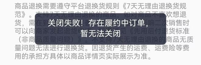“先用后付”的开通几乎是一键并无感的,关闭却需要花费一番工夫。记者需要找到“设置”—“支付”—“先用后付”三层页面才能找到关闭按键,但是系统以“存在履约订单”为由关闭失败。