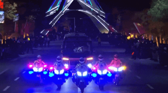 出征仪式后,在礼宾摩托车队护卫下,神舟十九号乘组蔡旭哲、宋令东、王浩泽3名航天员乘车前往发射场。