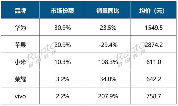 前三季度,华为在传统电商的的累计销量为208.3万台,同比增长23.5%,以30.9%的市场份额反超苹果,位列第一,均价为1549.5元。
