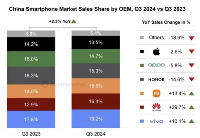 近日,三大数据机构相继公布了2024年三季度中国手机市场数据。据Counterpoint Research统计,国内只有华为、小米、vivo三家保证了正向的增长,增速分别为29.7%、13.4%与10.1%。