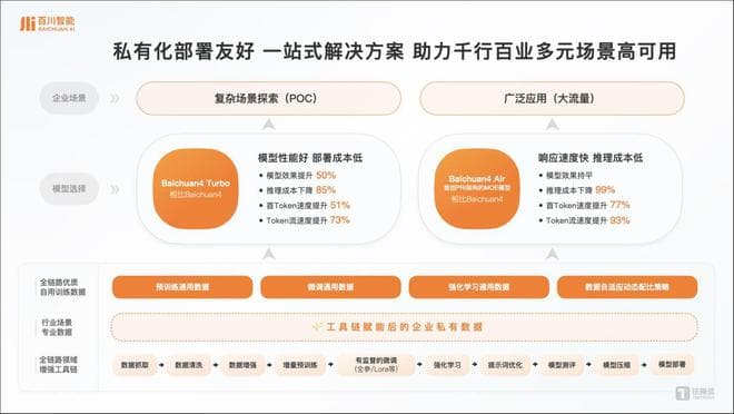 百川智能强调,全新的一站式解决方案,能够帮助企业以最低成本实现效果最佳的私有化部署,并支持企业将专有数据与百川智能自用的全链路优质训练数据混合,实现行业更高的多场景可用率。