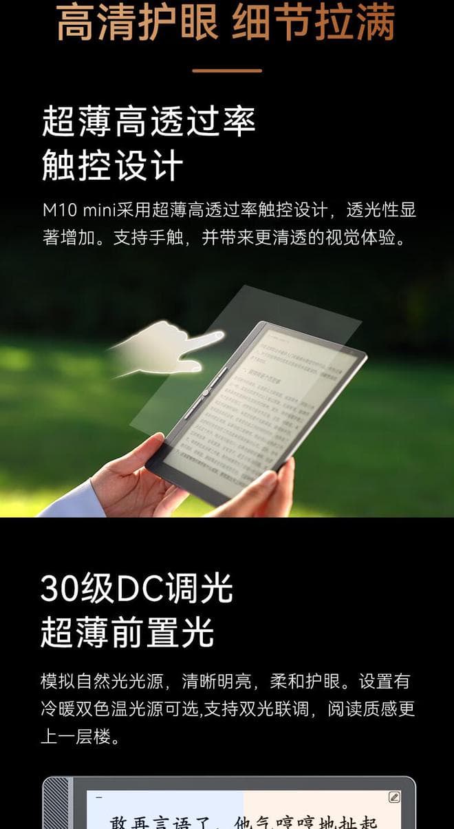 汉王 M10 mini采用超薄高透过率触控设计,透光性显著增加;模拟自然光光源,有冷暖双色温光源可选,支持双光联调;数字电磁笔 B5 支持 8192 级压感。