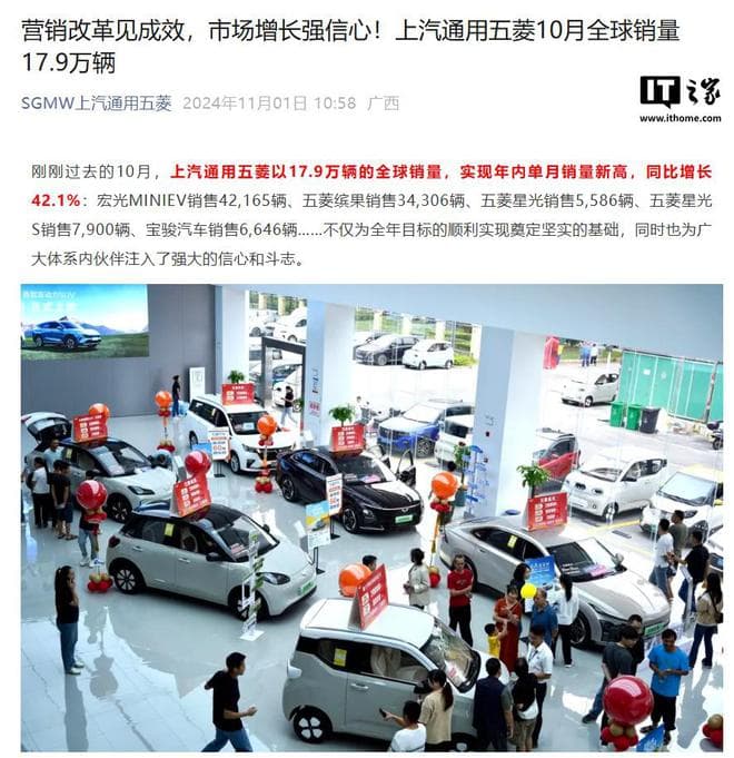 IT之家 11 月 1 日消息,上汽通用五菱今日宣布,2024 年 10 月达成 17.9 万辆的全球销量,实现年内单月销量新高,同比增长 42.1%。