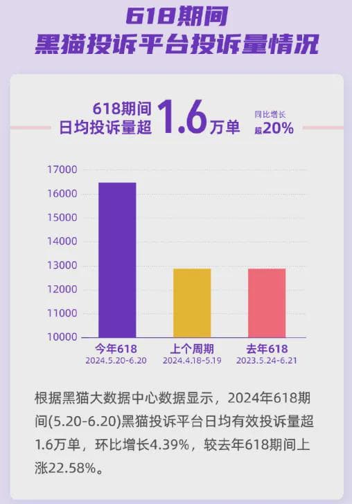 反映到消费者市场,低价、低质白牌商品大行其道,诱发电商行业的投诉量飞速飙升。黑猫大数据中心披露的《2024年618消费投诉数据报告》显示,2024年618期间,黑猫投诉平台日均有效投诉量超1.6万单,同比暴增22.58%。