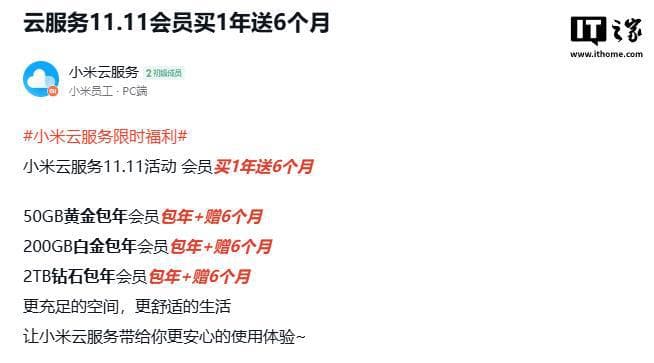 IT之家 11 月 2 日消息,小米云服务 11.11 活动于 10 月 31 日开启,与往年直接打折不同的是,今年公布的是“会员包年 + 赠 6 个月”的活动方式,引发网友热议。