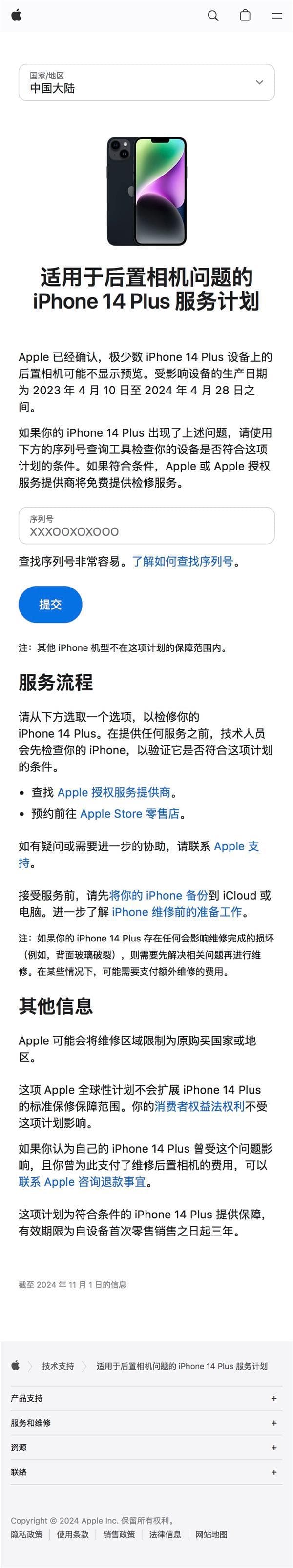 苹果表示,如果你的iPhone 14 Plus出现了上述问题,请使用序列号查询工具检查你的设备是否符合这项计划的条件,如果符合条件,Apple或Apple授权服务提供商将免费提供检修服务。