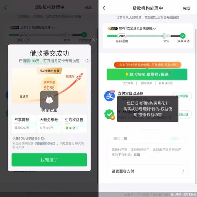 根据李萌向北京商报记者提供的截图,借款提交成功之后,平台弹窗推荐了一项增值服务,页面显示"可开通月花卡专属加速,购买立享专属提额、大额免息券以及生活权益包,仅售200元(享随机折扣)"。