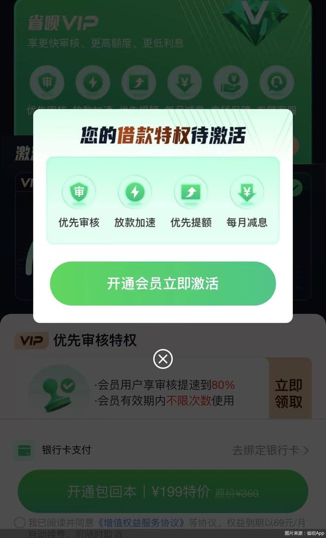 "这个平台会员产品太多了,包括各种放款特权、提额特权、加速特权,看得我眼花缭乱。"根据李萌向北京商报记者提供的页面截图来看,除了月花卡外,省呗平台还给她推荐了其他不同类型的会员权益,其中包括省呗VIP,售价199元;另外还有拿钱卡,金额49.9元;此外还有VIP加速卡,金额69.9元;以及省钱卡,售价39.9元,车主省钱卡,连续包月29.9元,其中大多开通方式为连续包月。