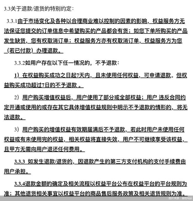 值得注意的是,《增值权益服务协议》明确标注,在权益购买成功之日起7天内,且未使用任何权益,可申请退款。
