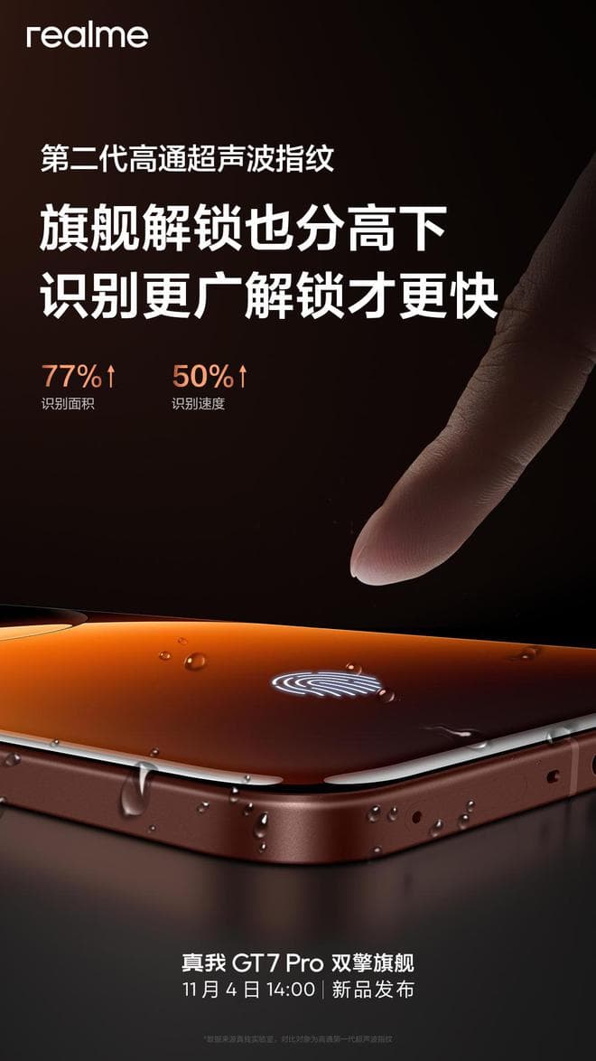 IT之家 11 月 3 日消息,真我手机今日再度发文预热,旗下 realme 真我 GT7 Pro 将搭载第二代高通超声波指纹,宣称比上代识别面积提升 77%、识别速度提升 50%。