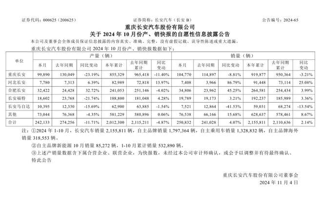 公告显示,2024 年 1-10 月,长安汽车销量 2,155,811 辆,自主品牌销量 1,797,364 辆,自主乘用车销量 1,328,832 辆,自主品牌海外销量 318,553 辆。