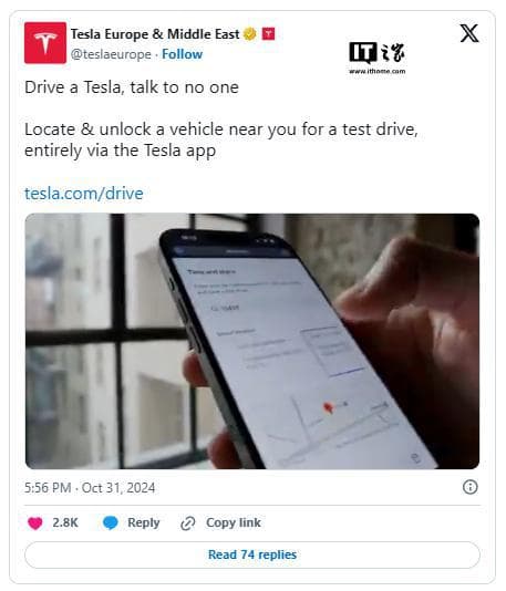 “驾驶一辆特斯拉,无需与人交谈。通过特斯拉应用程序,您可以找到并解锁附近的车辆进行试驾。”特斯拉欧洲和中东在 X 平台上的帖子中写道。